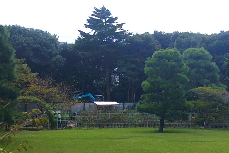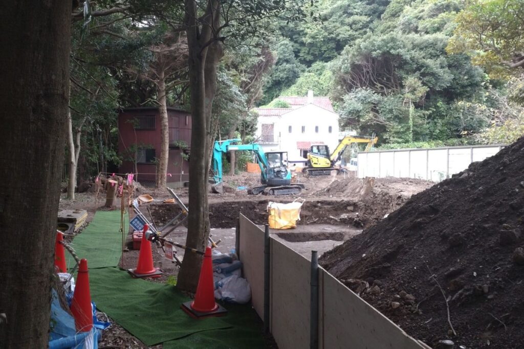 洋館の前の森では、樹木が伐採され、新管理棟・カフェの建設のための埋蔵文化財調査発掘が始まっていました。北条政子ゆかりの長楽寺の廃寺跡に建てられたのが旧前田邸であり、この谷戸全体が寺域であったと思われます。その歴史的価値が発掘で明らかになったとしても、鎌倉市はここにカフェを作るのでしょうか。説明会で示されたカフェや新管理棟の建物の完成予想図は、およそ景観とはマッチしないものと感じました。