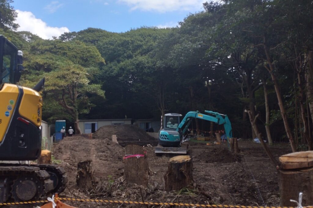 洋館前から東を見る。森はすでに伐採され、発掘が始まっていた。