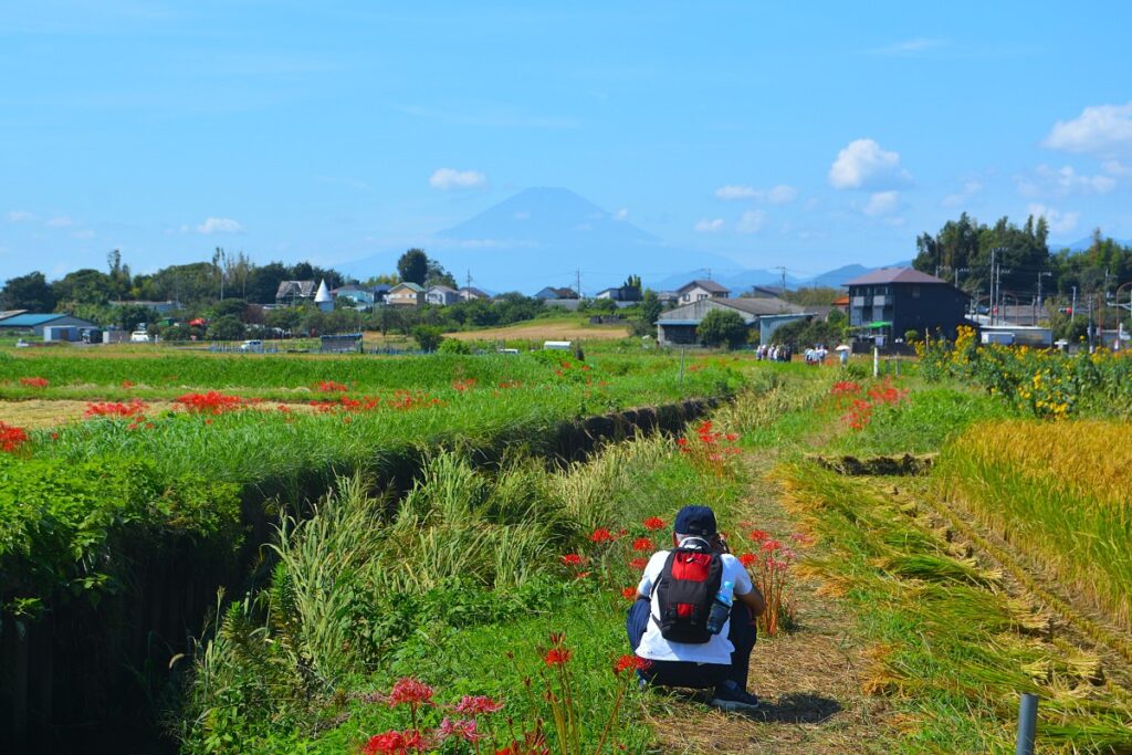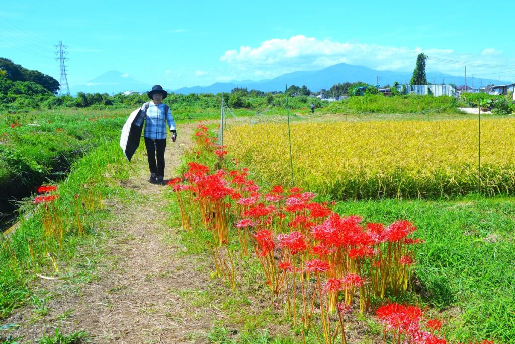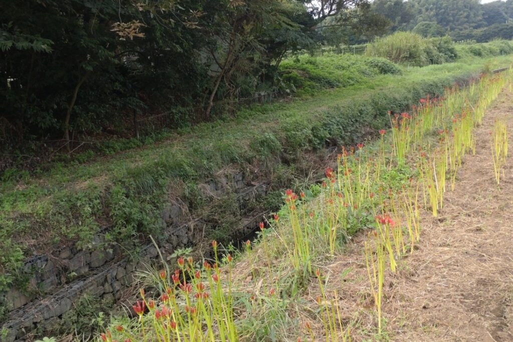 藤沢市の北部、茅ヶ崎市・寒川町との境に広がる田園地帯を流れる小出川は、川沿いの農道を農家の皆さんが整備して、9月下旬から10月上旬、見事な彼岸花(曼珠沙華)が咲きそろいます。秋の空の下、のんびりと歩くには最適ですが、あしもとはしっかりと。