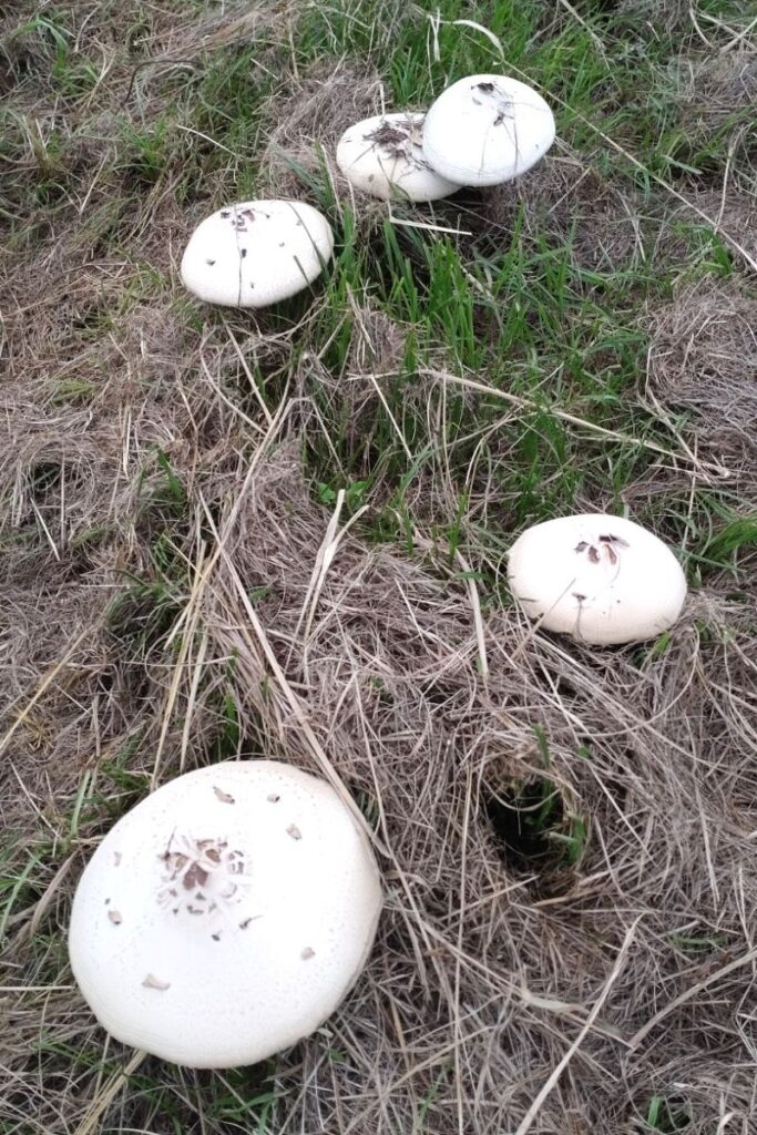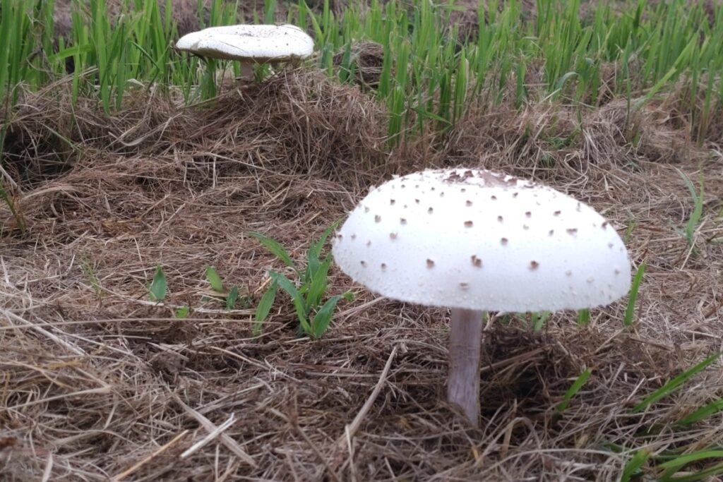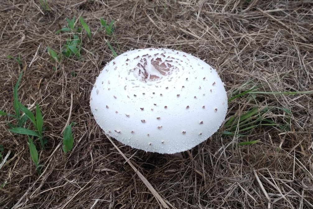 このキノコは、カラカサタケの仲間で、オオシロカラカサタケかコカラカサタケと言うようです。なんとどちらも毒キノコなんですよ。カラカサタケなら食べられるそうですが。食べるのはもちろん、手で採ったりするのも怖いですね。まるでふっくらした蒸しパンのようなので、うっかり持ち帰って食べなくて良かった。昔の同僚、理科の若松先生から教えていただきました。