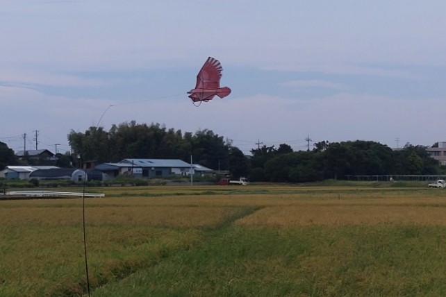 この鳥はしきりに田んぼの上を舞っていますが、しかしそれ以上には飛んでいきません。よく見るとかわいそうに・・・・。これは「カカシカラス」というそうです。これも若松先生の情報です。こんな大きな鳥がとぶようになったからか、昔の案山子はもう見かけることがないですね。カカシカラスはアマゾンでも買えるようです。