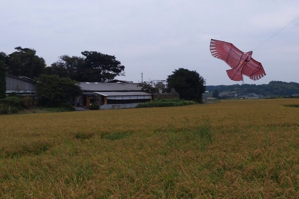 田んぼは見事に実り、稲刈りを待つばかり。そんな稲穂の上を、しきりにくるくる回っている大きな鳥が、何羽もいます。
