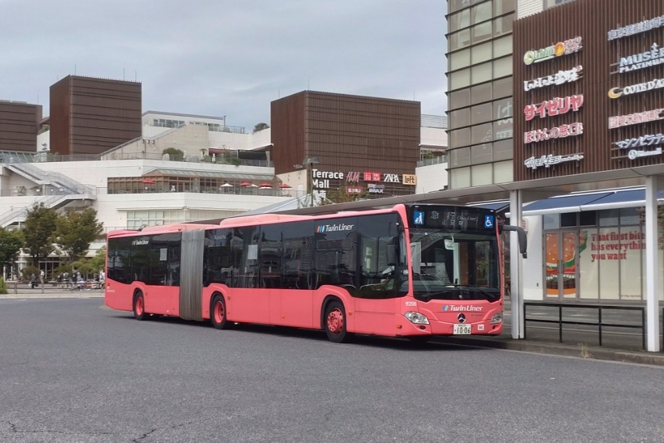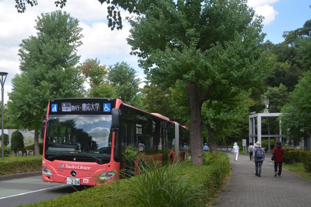 ツインライナーは珍しい連結バス。慶応大学や中高の学生用に運行されているので平日の朝晩しか運行されていません。この日は夏休み中でしたので、乗客は殆ど無し。10:05発に乗る。小出川彼岸花散策コールは途中の刈込で下車しますが、終点は大学構内の降車場です。