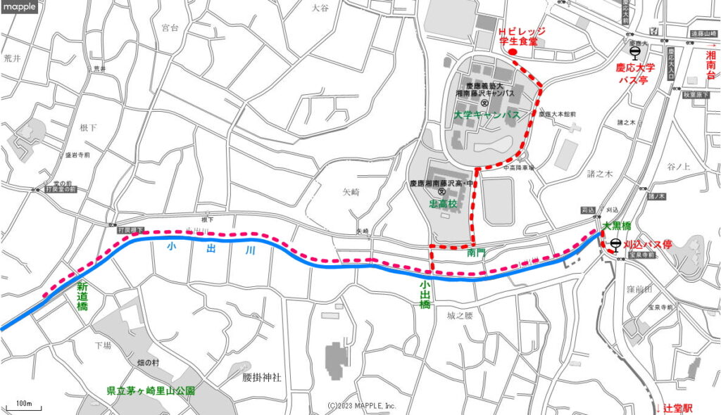 - 帰りは茅ヶ崎や寒川へのバスのありますが、バス停を探すより、途中で引き返し、刈込のバス停から帰るのが無難ですが、余力があったら、慶応大学バスターミナルまで歩いて、始発で辻堂駅または湘南台駅に向かうのが良いでしょう。お勧めは帰りに慶応湘南藤沢のキャンパス内を通ることですが、団体の場合は事前に大学の許可を取りましょう。