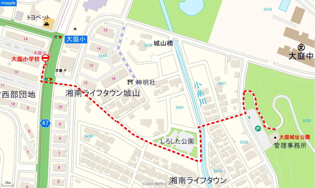 大庭小学校バス亭から大庭城址公園入り口までの道順(赤点線)