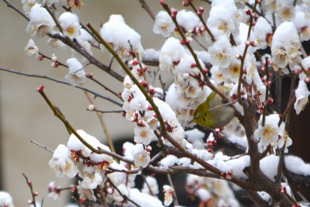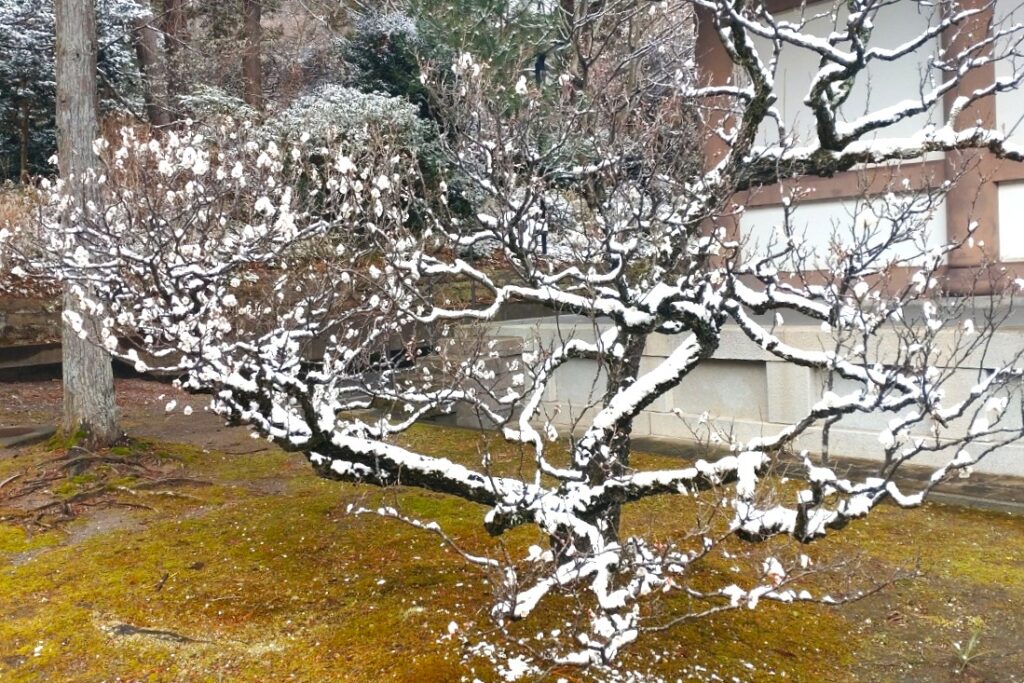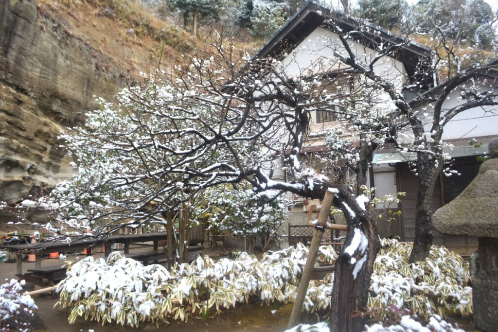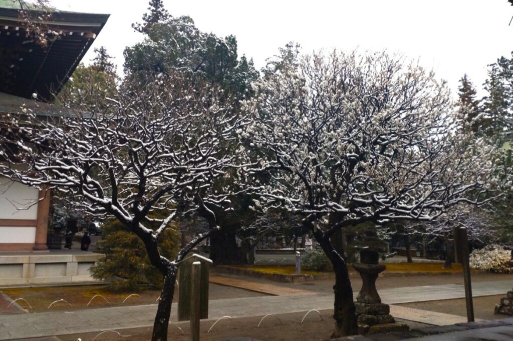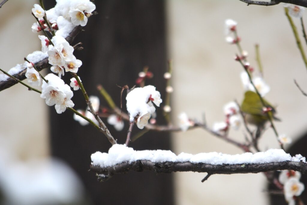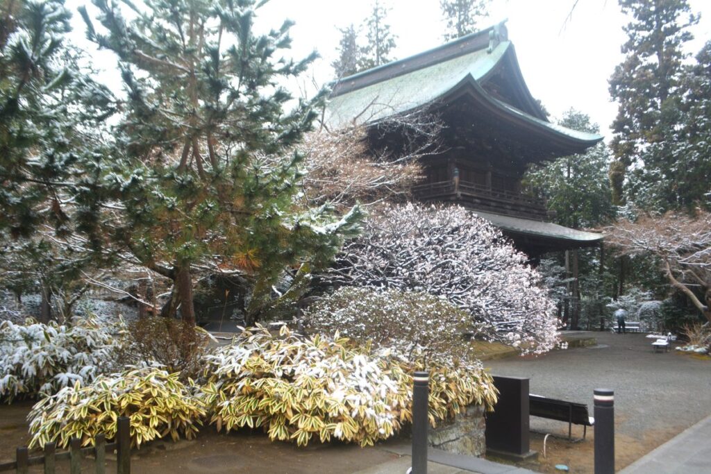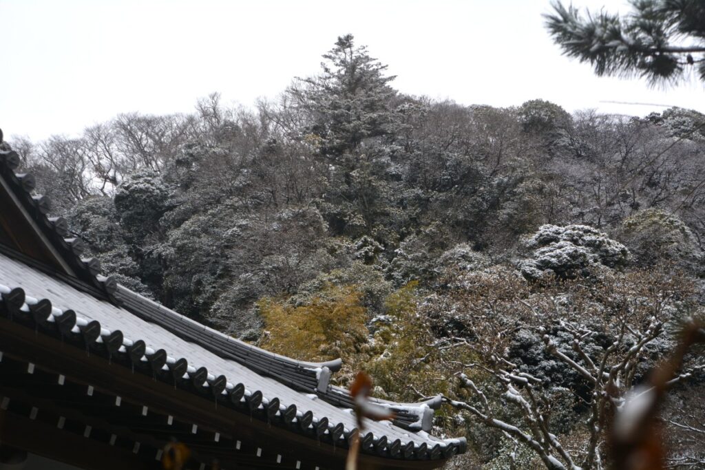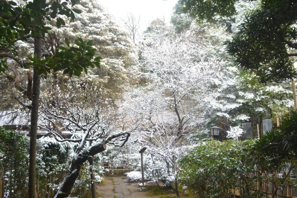 全国的な大雪の日、鎌倉も白の世界になりました。この日昼過ぎ、円覚寺を訪ねると、積もってはいませんでしたが、境内と周りの木々はすっかり雪化粧。早咲きの梅の花にも雪が降り積もり、風情があります。日曜日でしたがいつもよりも参詣の人は少なく、ゆっくりと境内を巡り、撮影できました。