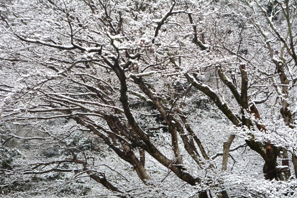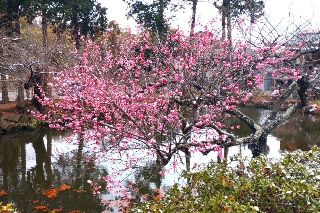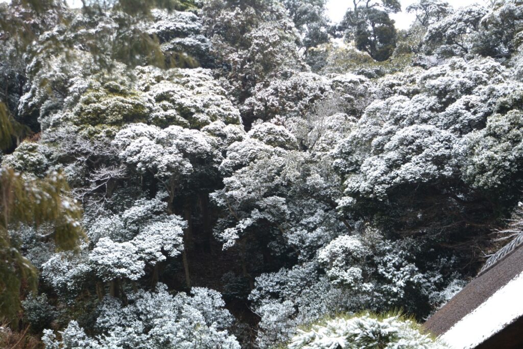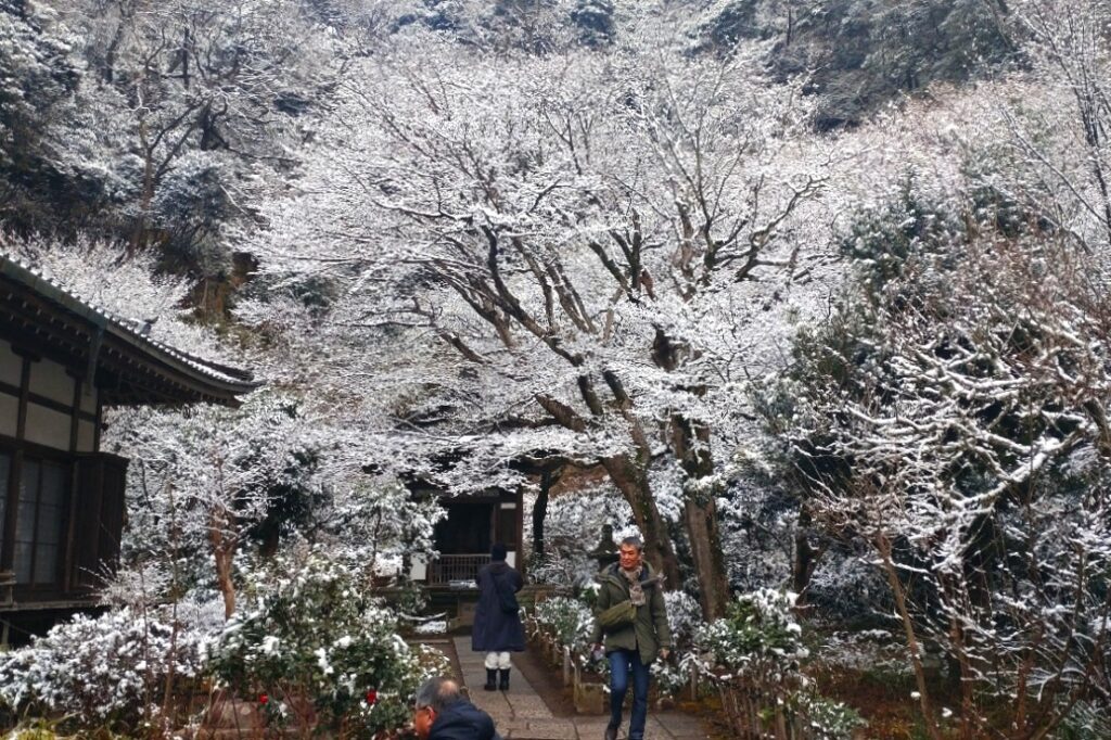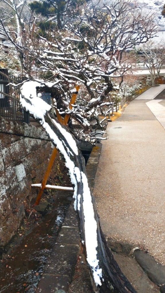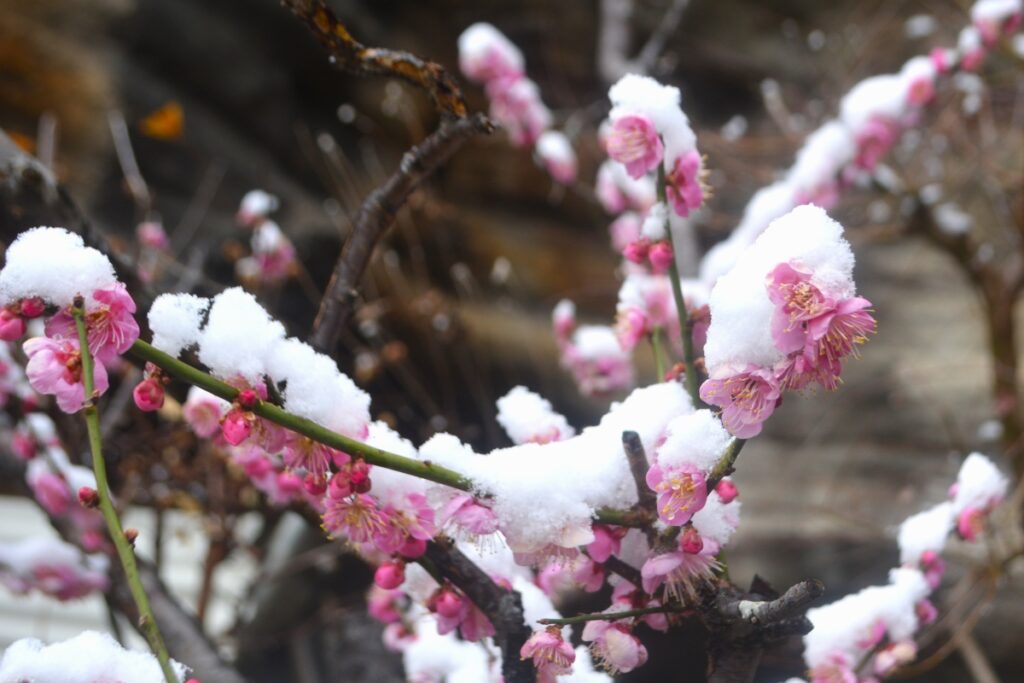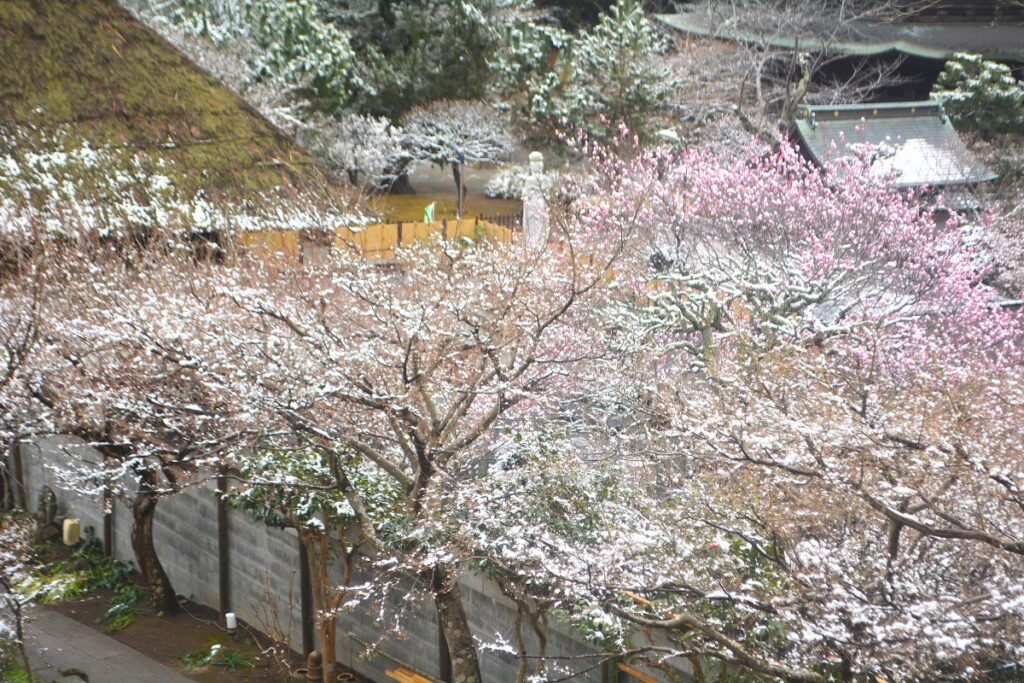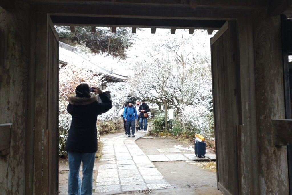 全国的な大雪の日、鎌倉も白の世界になりました。この日昼過ぎ、円覚寺を訪ねると、積もってはいませんでしたが、境内と周りの木々はすっかり雪化粧。早咲きの梅の花にも雪が降り積もり、風情があります。日曜日でしたがいつもよりも参詣の人は少なく、ゆっくりと境内を巡り、撮影できました。