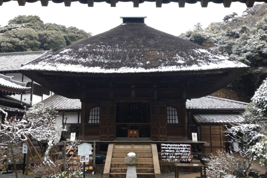 茅葺きの見事な屋根を持つお堂は江戸時代の文化8(1811)年に改築されたものです。客殿には延命地蔵が安置され、庵内には川端康成の小説『千羽鶴』に出てくる茶室烟足軒、大佛次郎寄贈の梅、魯迅ゆかりの木蓮やめずらしい多羅葉(葉書の木)などがあります。