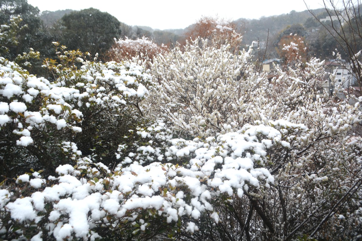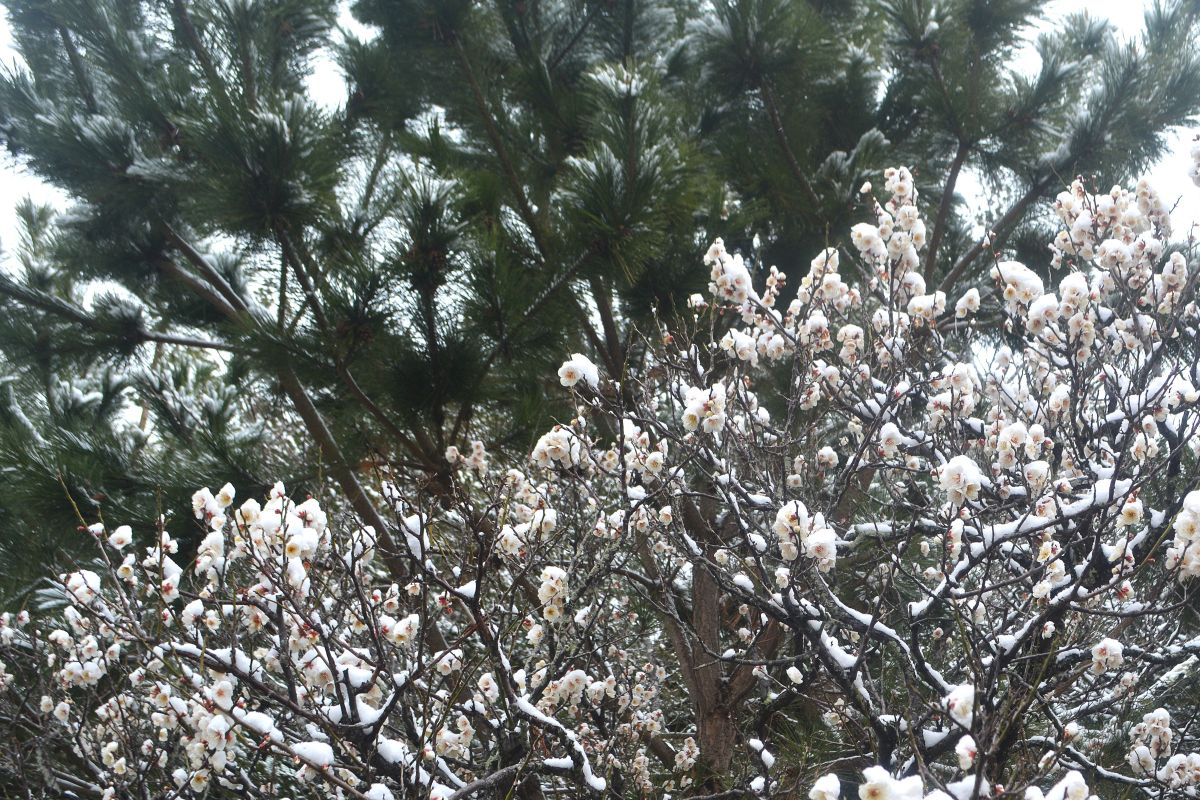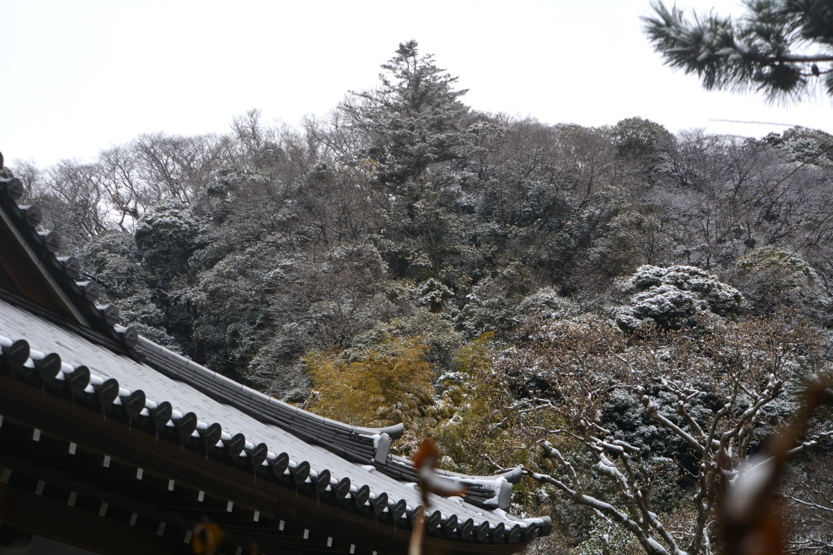 全国的な大雪の日、鎌倉も白の世界になりました。この日昼過ぎ、円覚寺を訪ねると、積もってはいませんでしたが、境内と周りの木々はすっかり雪化粧。早咲きの梅の花にも雪が降り積もり、風情があります。日曜日でしたがいつもよりも参詣の人は少なく、ゆっくりと境内を巡り、撮影できました。