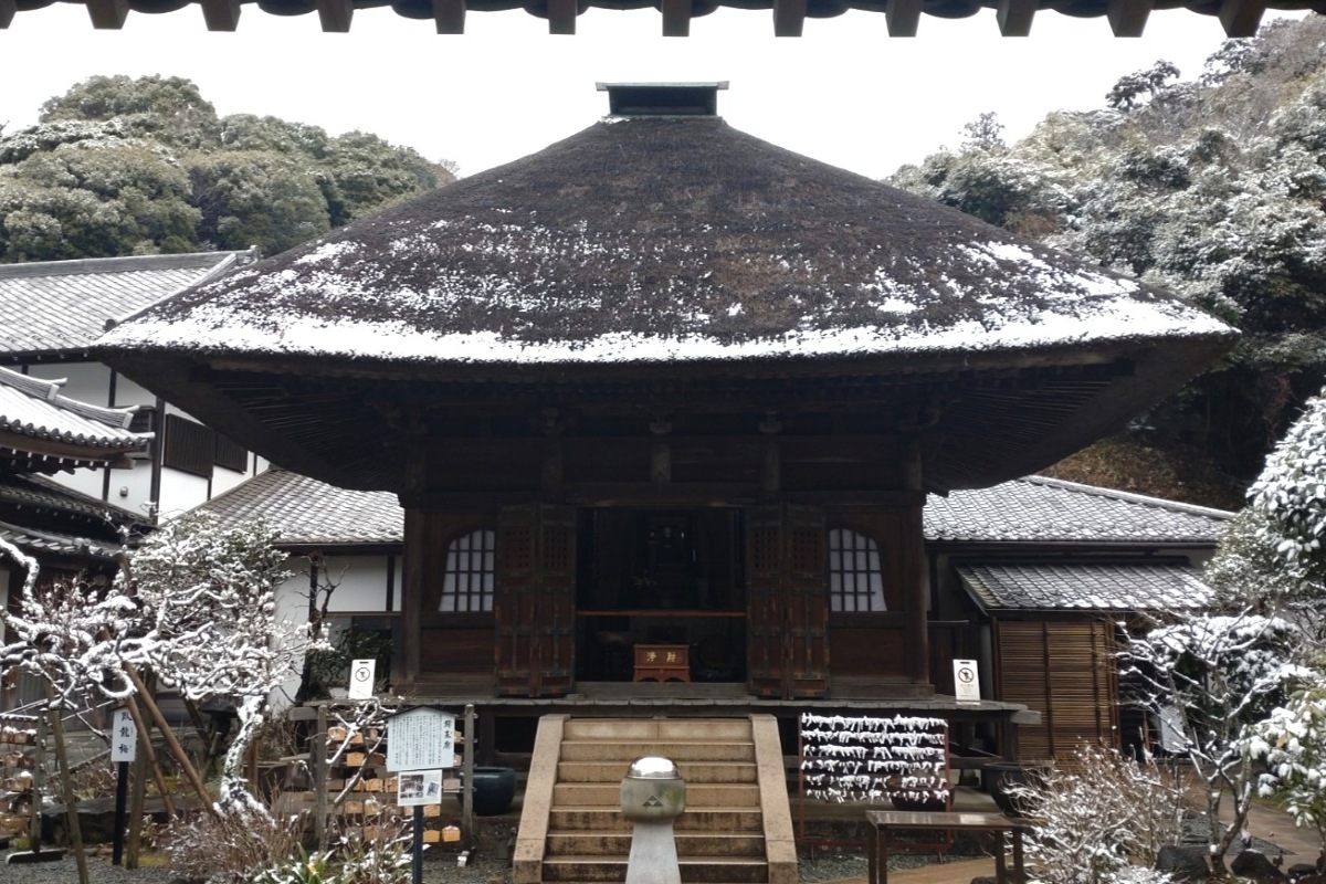 茅葺きの見事な屋根を持つお堂は江戸時代の文化8(1811)年に改築されたものです。客殿には延命地蔵が安置され、庵内には川端康成の小説『千羽鶴』に出てくる茶室烟足軒、大佛次郎寄贈の梅、魯迅ゆかりの木蓮やめずらしい多羅葉(葉書の木)などがあります。