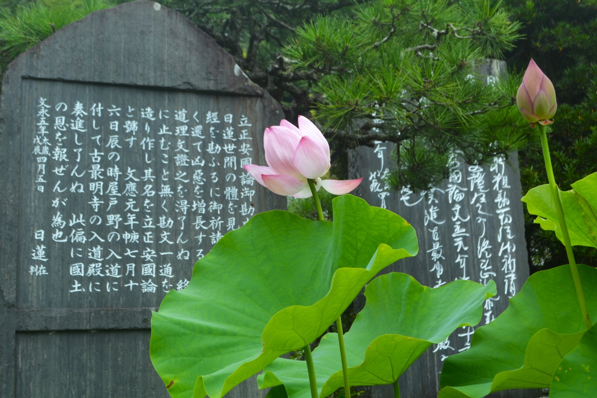本堂の前の大きな石碑に日蓮自筆の立正安国論由来の記が彫られています。