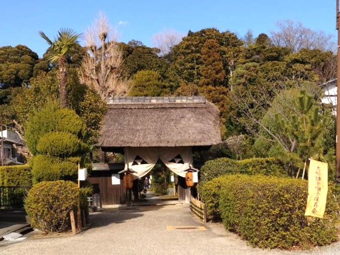 バス停常楽寺からやゝ大船寄りに戻ると、松の木を目印にして、そのもとに常楽寺の石標があります。そこを右手に入ると、常楽寺の萱葺きの山門が見えてきます。