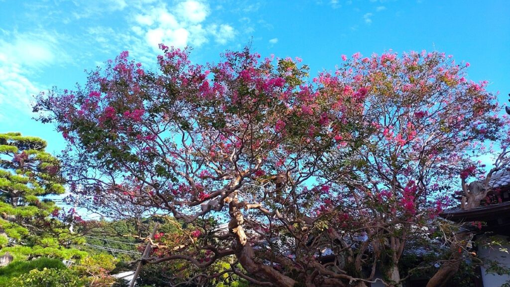 本覚寺の百日紅(さるすべり)はよく知られていますが、鎌倉では他に、極楽寺や材木座の補陀洛寺にも立派なものがあります。真夏の花として貴重ですね。