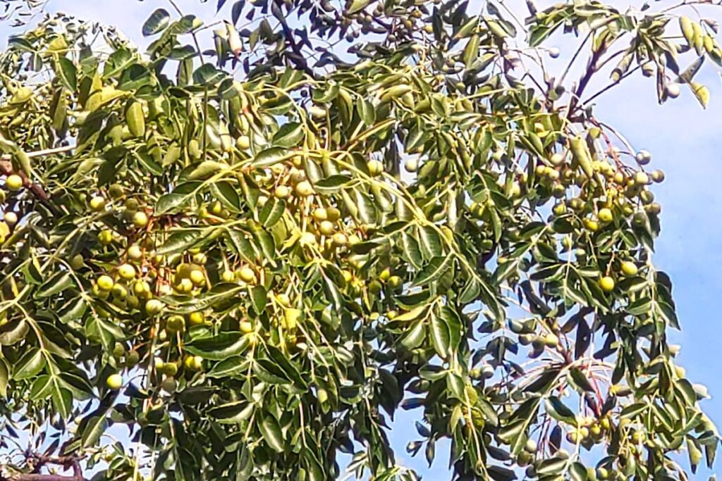 本覚寺の境内、夷堂の左手にはめずらしい栴檀の大木があります。春と夏、秋では違う姿になります。