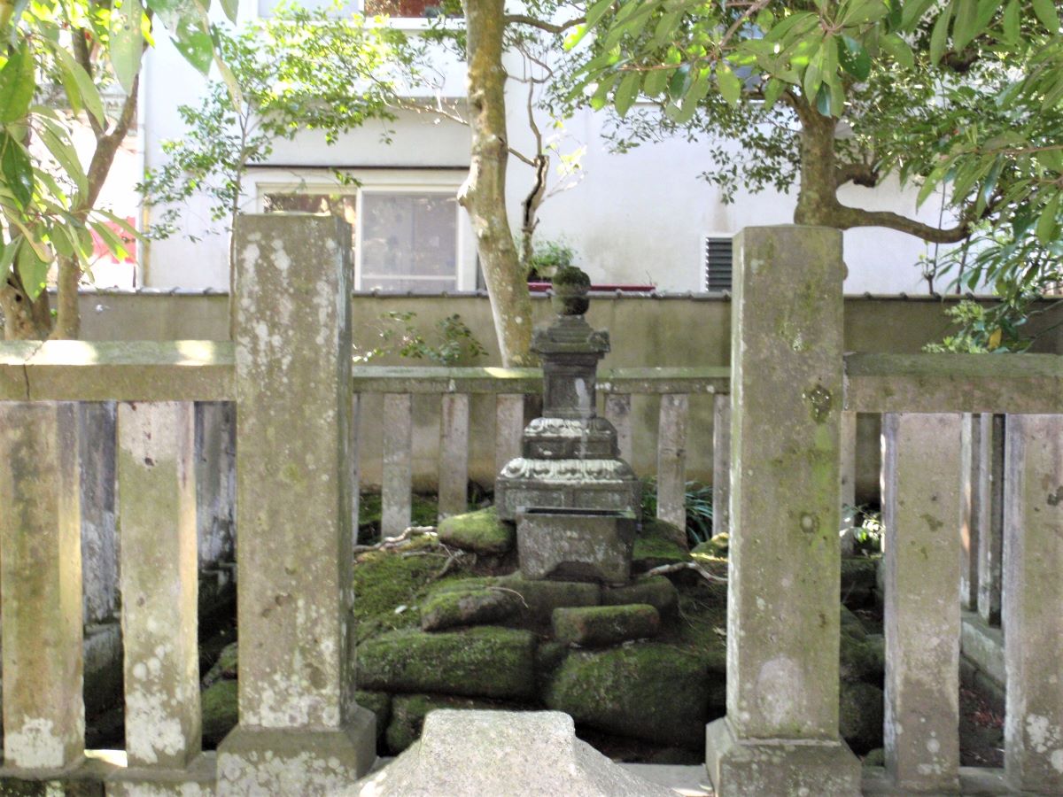 最明寺の一角だったと思われるところに時頼の廟所(位牌を祀るところ)として宝形造の建物が建てられており、その左手にある石塔がその墓と言われています。石塔は宝篋印塔や五輪塔などの部材を組み合わせたもので、後世に積み直したものと思われます。