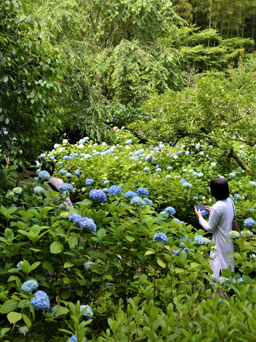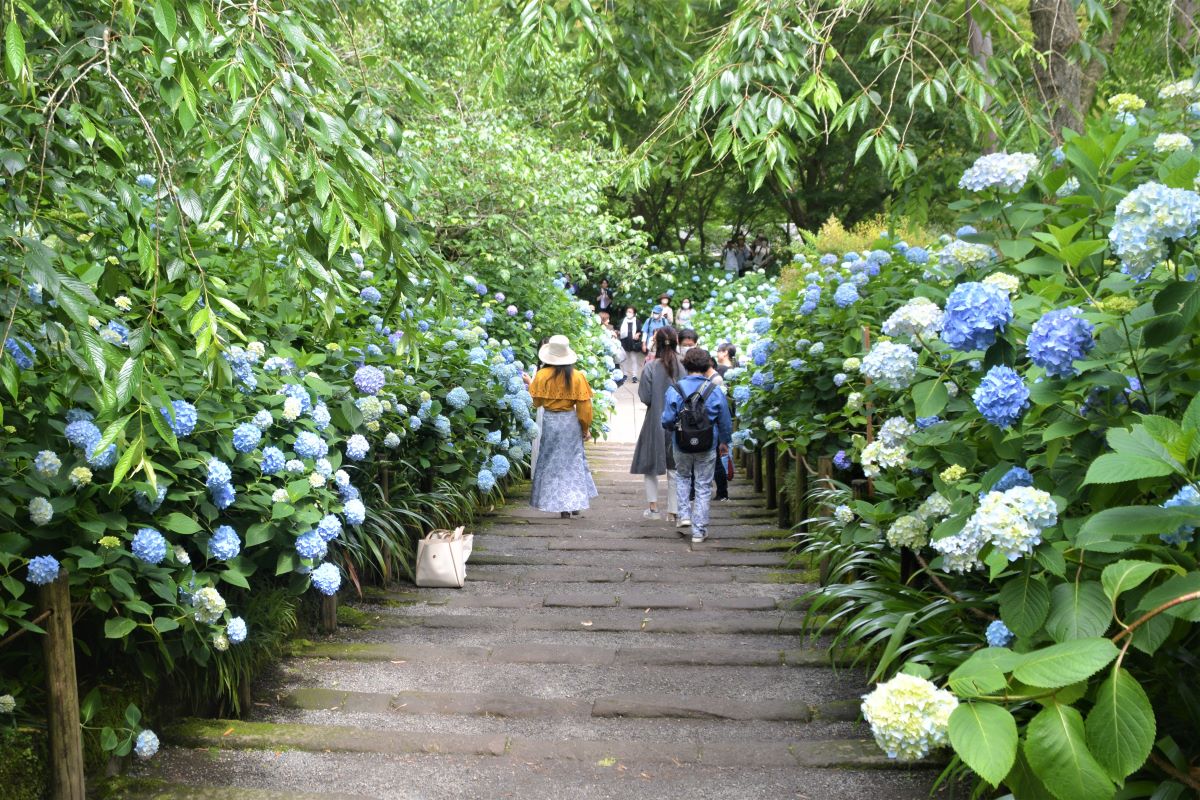 明月院と言えばアジサイがあまりにも有名ですが、そう言われるようになったのは戦後のことです。明月院のご住職が、歴史ある禅寺を生き返らせ、そしてまた戦後の荒廃した世相のなかで生きていく力になりたいと考え、境内に何か花を植えたいと考えました。たまたま植えたアジサイが、この土地に合い、「明月院ブルー」と言われる見事な薄青いアジサイが見事に咲くようになりました。