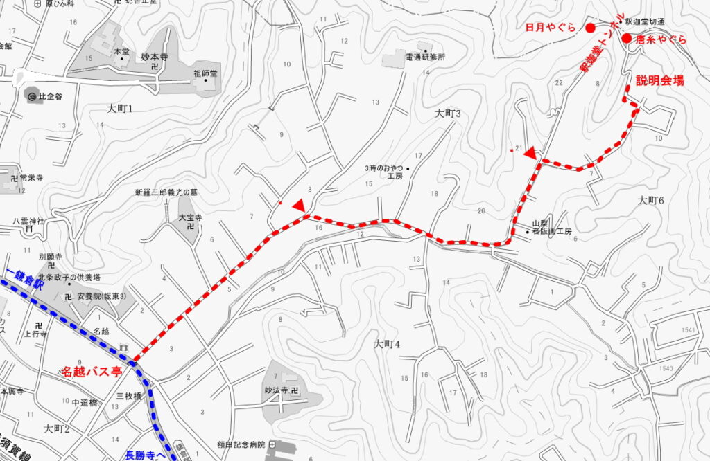 名越バス亭から釈迦堂口遺跡説明会場へのルート。狭い住宅街を抜けていくので、曲がるところ▼を間違えないようにしてください。