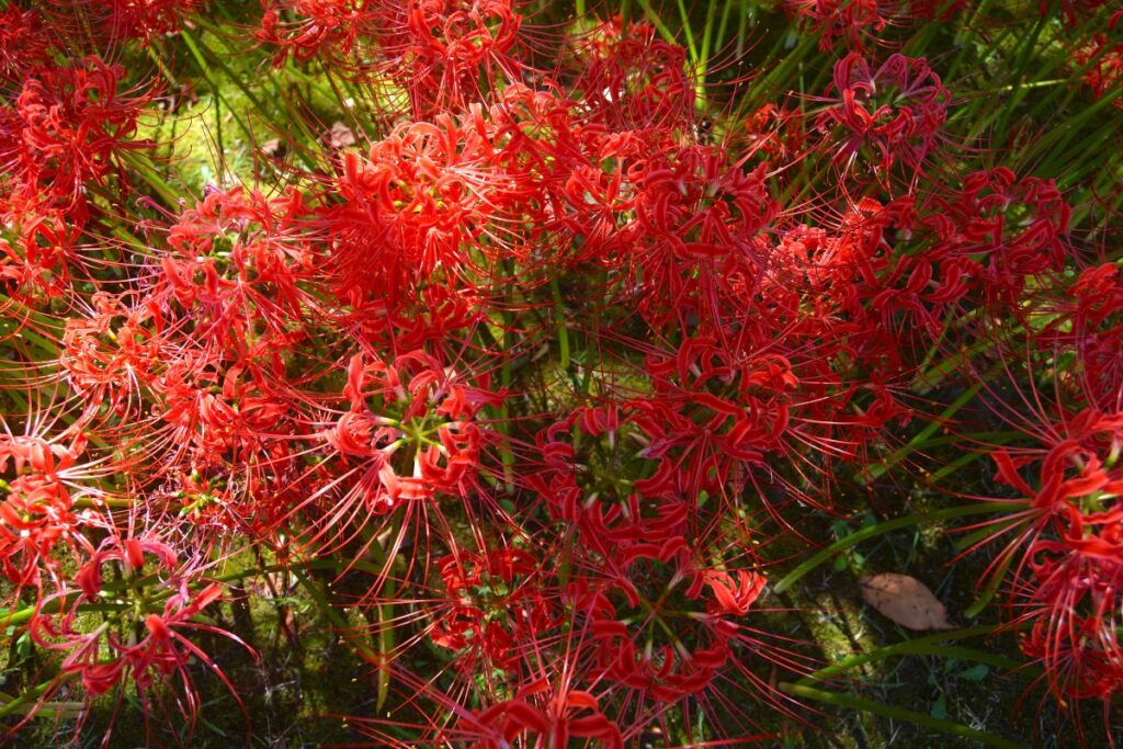 2025年の夏は猛暑が続き、彼岸花(曼珠沙華)の開花は例年よりも10日ほど遅れたようです。9月26日に訪ねましたが、ほぼ満開、真っ赤な彼岸花だけでなく、白や黄色などのものもあってまさに花の競演と言ったところでした。