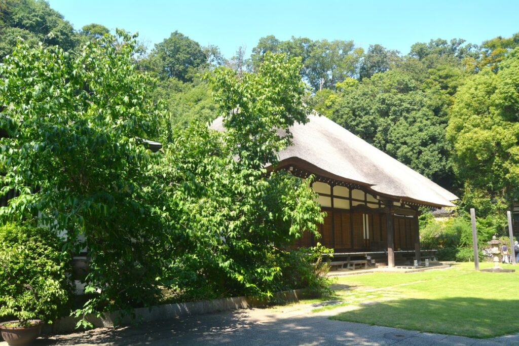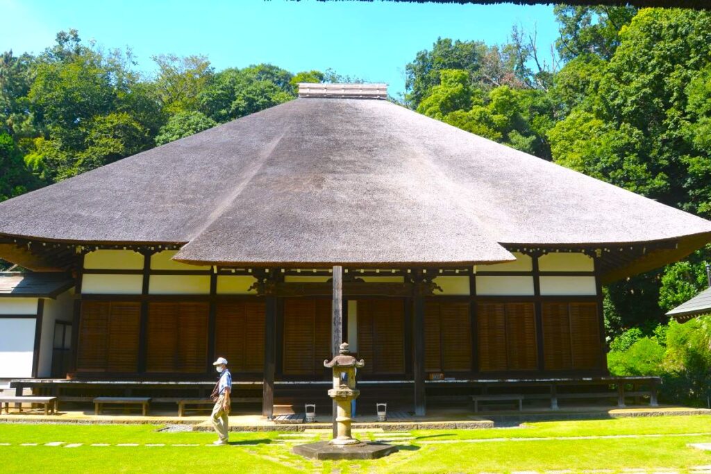 山門の向こう側に見えていたのが本堂。独特の形をした、真新しい茅葺きの屋根が輝いているように見えておもわず声が出そう。